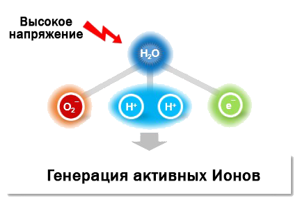Высокое напряжение подаётся на положительные и отрицательные электроды. Электроды производят коронный (молния) разряд, H2O и другие молекулы распадаются на (H+), (O2-), (OH-), (HOO-) Ионы во время реакции.